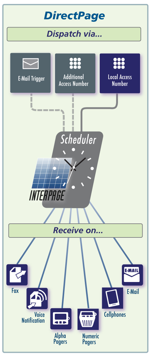 DirectPage customers receive a local numeric number which functions identically to a numeric pager: When a message is received, DirectPage immediately sends the received numeric page to one or more cellphones, pagers, e-mail addresses, SMS/MMS/Internet-enabled mobile devices, fax and/or POTS lines. DirectPage account holders may customize messaging notification schedules to selectively page a specific device, such as an "on-call" cellphone or home phone, based on the received Touch Tones (DTMF), CallerID/NameID, and/or a weekly schedule rotation.